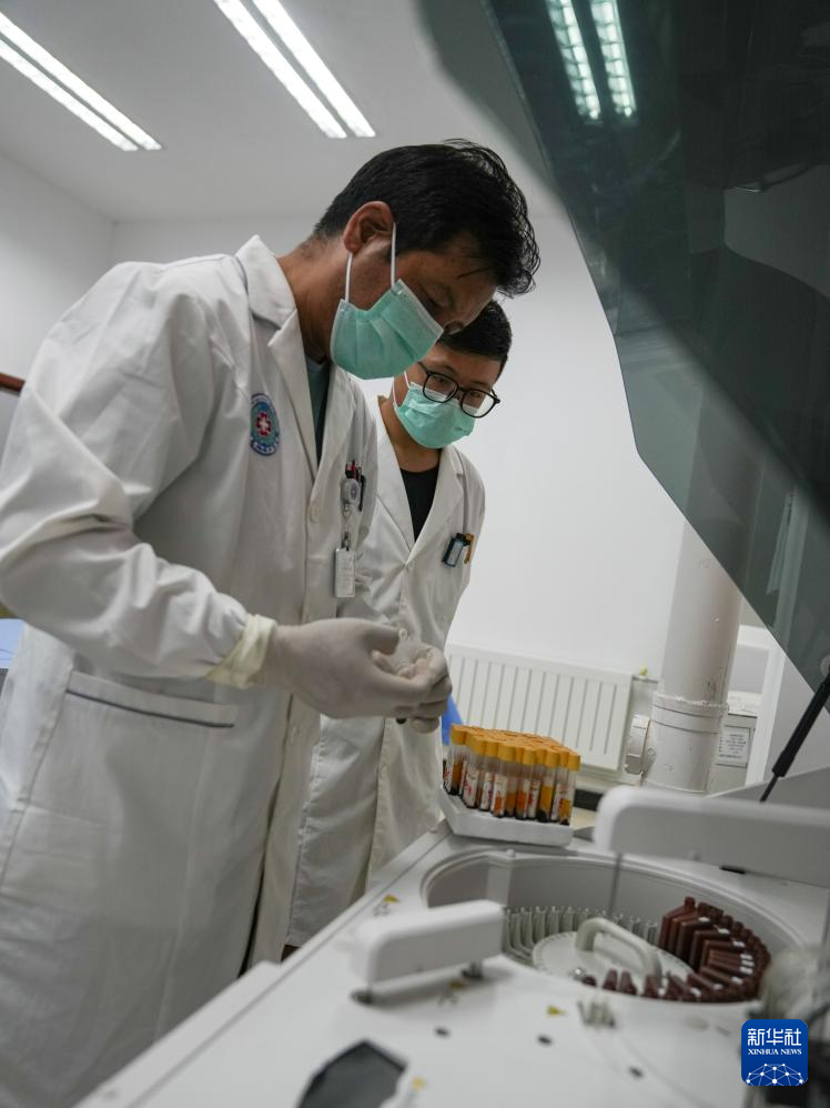 8月30日,林周县强嘎乡卫生院医生东智才让使用生化分析仪检测患者肝功能和肾功能状况。新华社记者 晋美多吉 摄