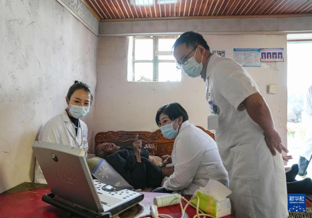 8月30日,义诊队在重症病人家中为病人做腹部B超。新华社记者 晋美多吉 摄