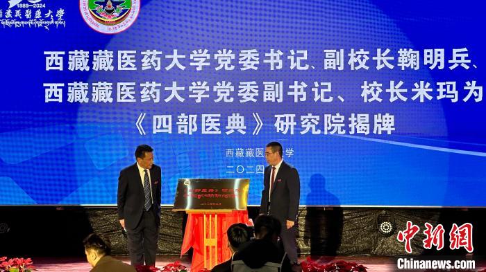 7日下午,《四部医典》研究院揭牌仪式在西藏藏医药大学举行,西藏藏医药大学党委书记、副校长鞠明兵和西藏藏医药大学党委副书记、校长米玛共同为《四部医典》研究院揭牌。