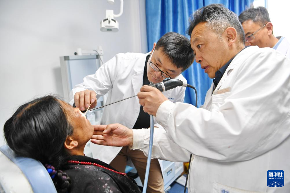8月27日,王克明博士和西藏自治区人民医院医生为一名农牧民查体。新华社记者 张汝锋 摄