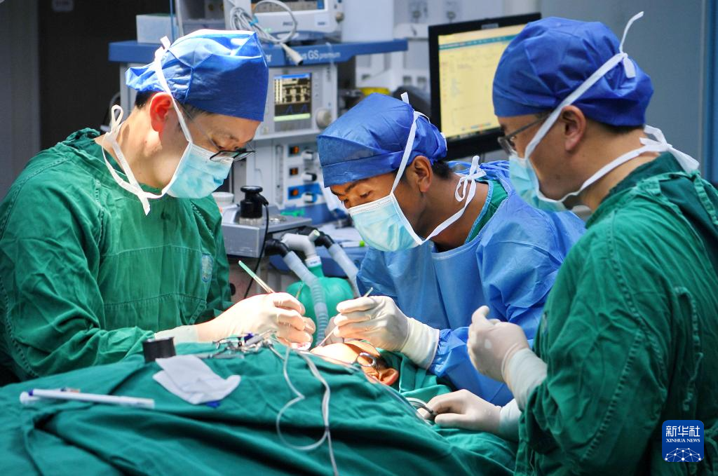 8月29日,王克明博士(左)和西藏自治区人民医院医生为患者实施手术。新华社记者 张汝锋 摄