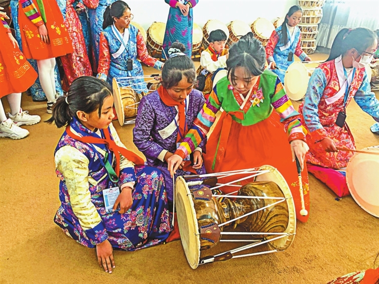在“吉藏一家亲”冬令营活动中,日喀则学生在朝鲜族学生指导下学习打朝鲜族长鼓。