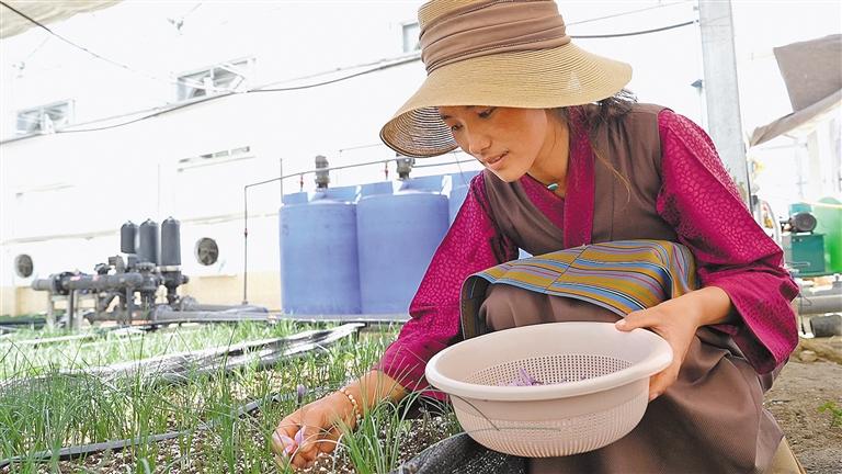工作人员在采摘藏红花。记者 索朗旺久 通讯员 次旺伦珠 摄