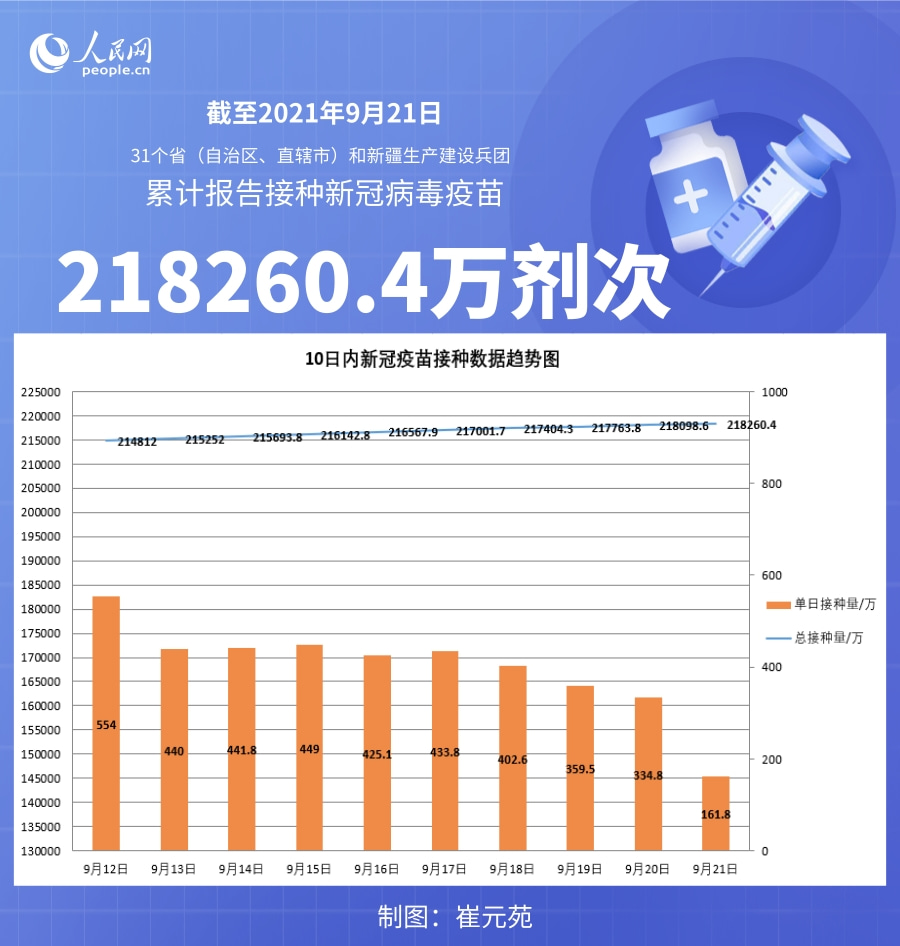 国家卫健委:截至9月21日全国累计接种新冠病毒疫苗218260.4万剂次