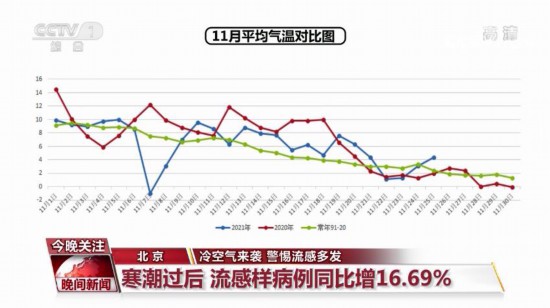再来看温度更低的北方。北京市疾控部门的流感监测结果显示:本月15日至21日,北京市二级以上医院接诊流感样病例的人数为11689人,与去年同期相比上升了16.69%。为什么变化这么大呢?来看一看这周之前的天气。
