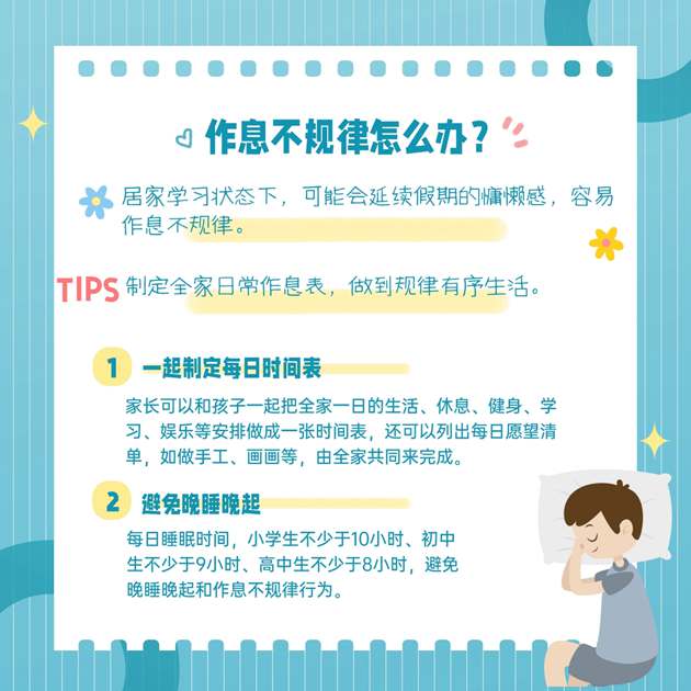 编者按:关于家庭教育,你了解多少?疫情期间,居家学习、上网课,孩子容易出现运动不足、视力下降、作息不规律、学习效率不高等现象,怎么办?家长应该如何面对孩子出现的种种问题?教你6招巧应对!