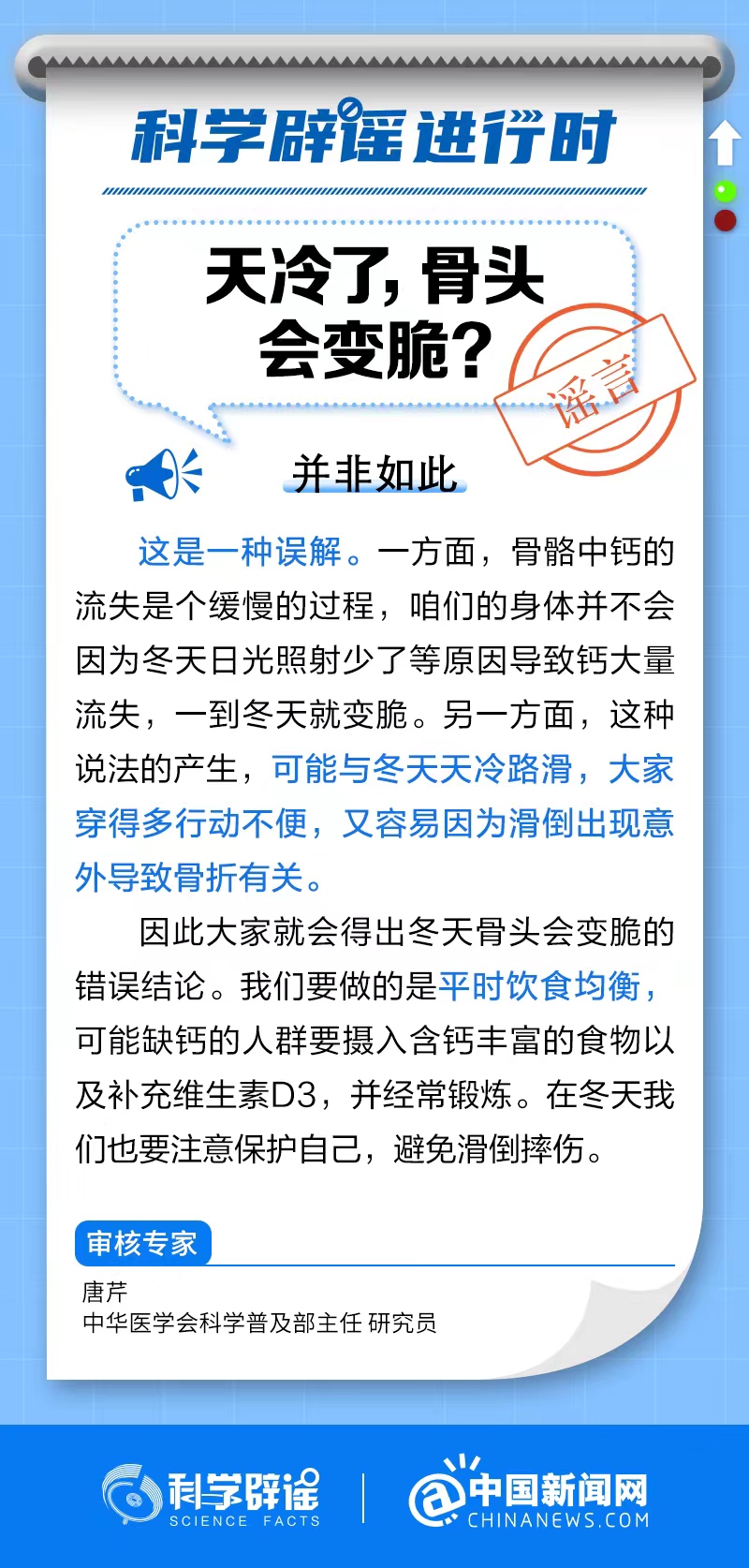这是一种误解。骨骼中钙的流失是个缓慢的过程,人的身体并不会因为冬天日光照射少了等原因导致钙大量流失。另一方面,这种说法的产生,可能与冬天天冷路滑,大家容易因为滑倒出现意外导致骨折有关。(来源:@科学辟谣 中国新闻网微博 )