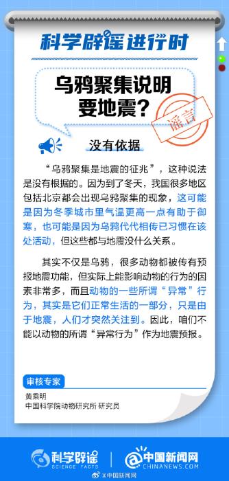 “乌鸦聚集是地震的征兆”这种说法是没有根据的。到了冬天,我国很多地区都会出现乌鸦聚集的现象,这可能是因为冬季城市里气温更高一点有助于御寒,也可能是因为乌鸦代代相传已习惯在该处活动,这些都与地震没什么关系。(来源:@科学辟谣 中国新闻网微博)