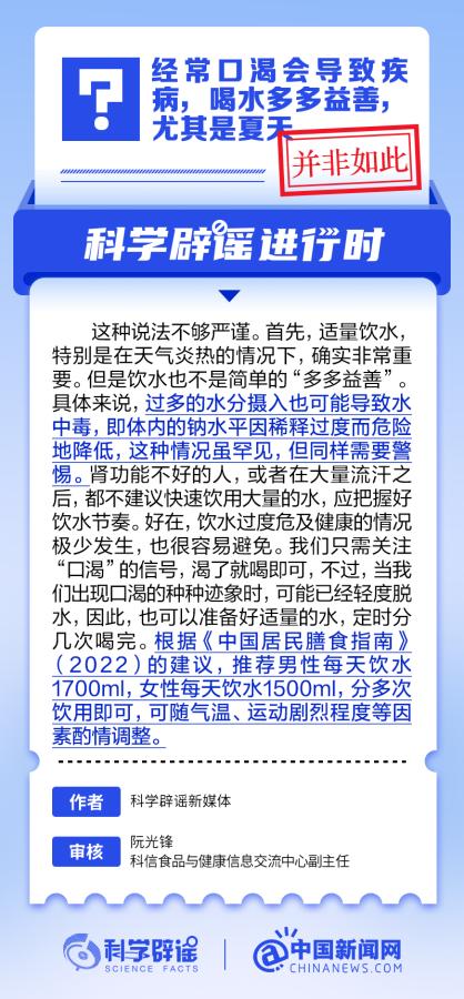 适量饮水,特别是在天气炎热的情况下,确实非常重要。但是饮水也不是简单的“多多益善”。过多的水分摄入也可能导致水中毒,即体内的钠水平因稀释过度而危险地降低,这种情况虽罕见,但同样需要警惕。再者,肾功能不好或大量流汗之后,也不建议快速饮用大量的水,应把握好饮水节奏。(来源:科学辟谣 中国新闻网微博 )