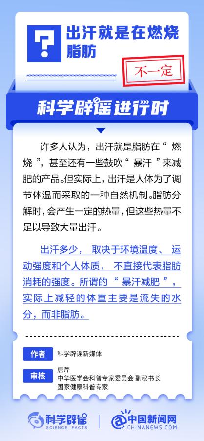 许多人认为,出汗就是脂肪在“燃烧”,甚至还有一些鼓吹“暴汗”来减肥的产品。但实际上,出汗是人体为了调节体温而采取的一种自然机制。脂肪分解时,会产生一定的热量,但这些热量不足以导致大量出汗。出汗多少,取决于环境温度、运动强度和个人体质,不直接代表脂肪消耗的强度。所谓的“暴汗减肥”,实际上减轻的体重主要是流失的水分,而非脂肪。(来源:@科学辟谣 中国新闻网微博 )