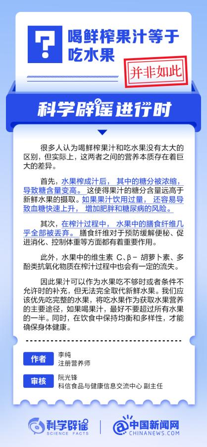 很多人认为喝鲜榨果汁和吃水果没有太大的区别,但实际上,这两者之间的营养本质存在着巨大的差异。水果榨成汁后,其中的糖分被浓缩,导致糖含量变高。其次,在榨汁过程中,水果中的膳食纤维几乎全部被丢弃。此外,水果中的维生素C、β-胡萝卜素、多酚类抗氧化物质在榨汁过程中也会有一定的流失。(来源:@科学辟谣 中国新闻网微博 )