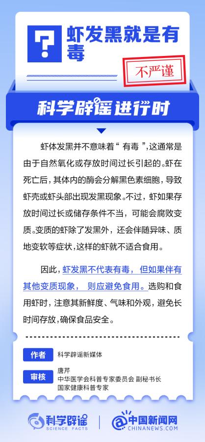 虾体发黑并不意味着“有毒”,这通常是由于自然氧化或存放时间过长引起的。虾在死亡后,其体内的酶会分解黑色素细胞,导致虾壳或虾头部出现发黑现象。虾如果存放时间过长或储存条件不当,可能会腐败变质。变质的虾除了发黑外,还会伴随异味、质地变软等症状,这样的虾就不适合食用。(来源:@科学辟谣 中国新闻网微博)