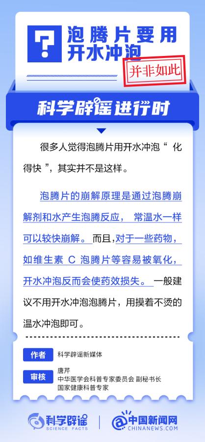很多人觉得泡腾片用开水冲泡“化得快”,其实并不是这样。泡腾片的崩解原理是通过泡腾崩解剂和水产生泡腾反应,常温水一样可以较快崩解。而且,对于一些药物,如维生素C泡腾片等容易被氧化,开水冲泡反而会使药效损失。(来源:@科学辟谣 中国新闻网微博)