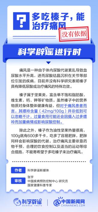 痛风是一种由于体内尿酸代谢紊乱导致血尿酸水平升高,进而尿酸结晶沉积在关节等部位引发的疾病,目前并没有科学研究表明榛子具有降低尿酸或治疗痛风的特殊功效。虽然榛子中的营养物质对身体整体健康有益,但对于痛风患者而言,其嘌呤含量(42mg/100g)并非低到可以忽略不计,过量食用可能还会因摄入过多嘌呤而加重病情或影响尿酸控制。(来源:@科学辟谣 中国新闻网微博)
