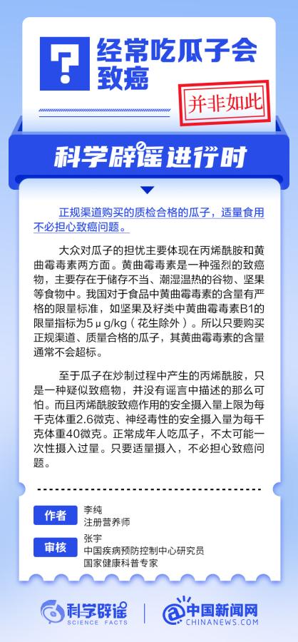 大众对瓜子的担忧主要体现在丙烯酰胺和黄曲霉毒素两方面。我国对于食品中黄曲霉毒素的含量有严格的限量标准,只要购买正规渠道、质量合格的瓜子,其黄曲霉毒素的含量通常不会超标。至于瓜子在炒制过程中产生的丙烯酰胺,只是一种疑似致癌物,而且丙烯酰胺致癌作用的安全摄入量上限为每千克体重2.6微克、神经毒性的安全摄入量为每千克体重40微克。正常成年人吃瓜子,不太可能一次性摄入过量。(来源:@科学辟谣 中国新闻网微博)