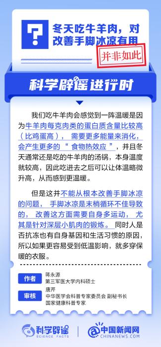 我们吃牛羊肉会感到温暖是因为牛羊肉每克肉类的蛋白质含量比较高,需要更多能量来消化,这会产生更多的“食物热效应”。并且,冬天通常吃的还是牛羊肉的汤锅,本身温度就较高,因此吃进去之后可以让体温略微升高。但是这并不能从根本改善手脚冰凉的问题。(来源:@科学辟谣 中国新闻网微博 )