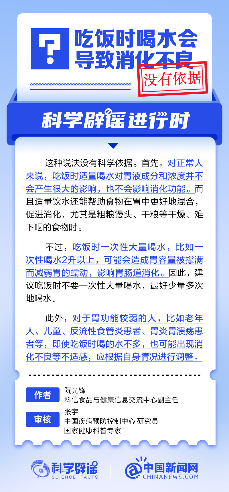 对正常人来说,吃饭时适量喝水对胃液成分和浓度并不会产生很大的影响,也不会影响消化功能。不过,吃饭时一次性大量喝水,比如一次性喝水2升以上,可能会造成胃容量被撑满而减弱胃的蠕动,影响胃肠道消化。因此,建议吃饭时不要一次性大量喝水,最好少量多次地喝水。(来源:@科学辟谣 中国新闻网微博)