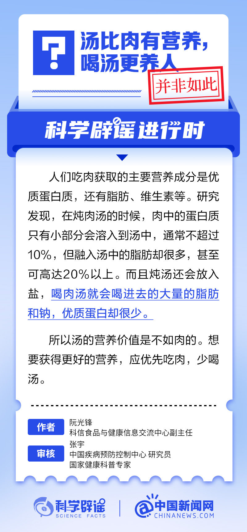 人们吃肉获取的主要营养成分是优质蛋白质,还有脂肪、维生素等。研究发现,在炖肉汤的时候,肉中的蛋白质只有小部分会溶入到汤中,通常不超过10%,但融入汤中的脂肪却很多,甚至可高达20%以上。(来源:@科学辟谣 中国新闻网微博)