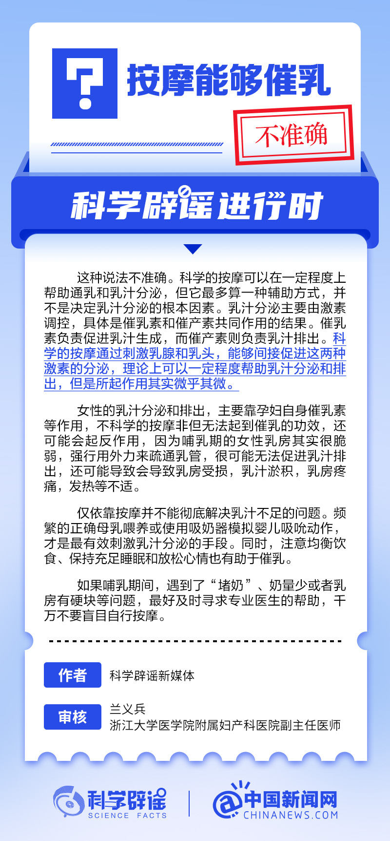 科学的按摩可以在一定程度上帮助通乳和乳汁分泌,但它最多算一种辅助方式,并不是决定乳汁分泌的根本因素。乳汁分泌主要由激素调控。科学的按摩,能够间接促进激素的分泌,理论上可以一定程度帮助乳汁分泌和排出,但是所起作用其实微乎其微。(来源:@科学辟谣 中国新闻网微博)
