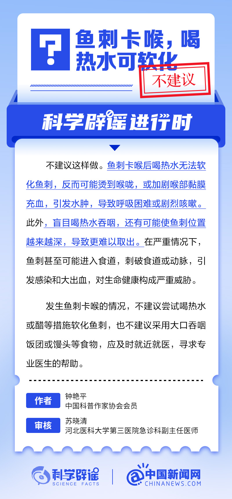 鱼刺卡喉后喝热水无法软化鱼刺,反而可能烫到喉咙,或加剧喉部黏膜充血,引发水肿,导致呼吸困难或剧烈咳嗽。盲目喝热水吞咽,还有可能使鱼刺位置越来越深,导致更难以取出。(来源:@科学辟谣 中国新闻网微博)