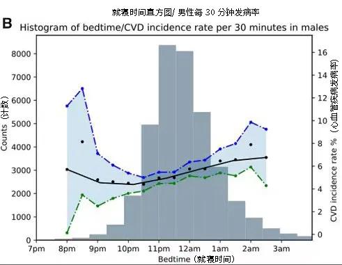 然后,研究人员对他们进行了平均时长为5.7年的随访,发现有3172名(3.58%)被试患上了心血管疾病,包括:心肌梗塞、心力衰竭、慢性缺血性心脏病、中风和短暂性脑缺血发作。这些心血管疾病患者当中,有43%在凌晨及更晚睡,38% 在23~24点间睡,而仅有15%在22~23点间睡,4%在22点前睡。
