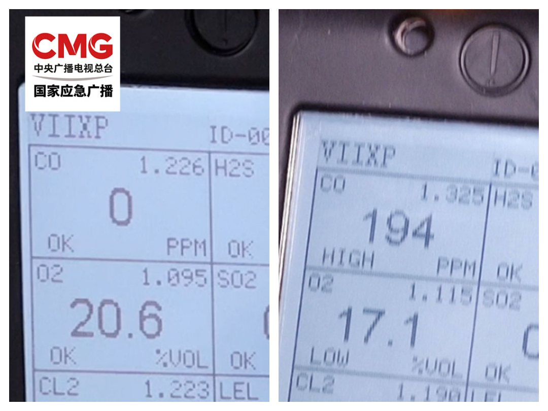 左图为实验前室内气体数值,右图为关闭门窗、打开油烟机几分钟后的气体数值。一氧化碳含量由0ppm上升至194ppm(70ppm为高报警数值);氧气含量由实验开始前的20.6%Vol下降至17.1%Vol以下(19.5%Vol为仪器低报警数值)。