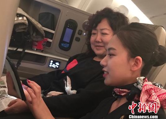 图为东航空姐指导小乘客正确使用平板电脑(Pad)。