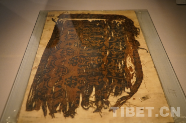 这件2012年在阿里噶尔县故如甲木墓地出土的织锦,以藏青和橙黄双色为主,织锦上出现了孔雀、鸟等动物。提起织锦出土的故事,还颇有些意思。据中国社会科学院考古研究所副研究员仝涛讲述,墓地所在地本来是一座苯教的寺院,当时寺院附近正在修公路。一辆载重汽车陷入坑中,当周围僧众帮忙抬起卡车时,看到了许多青铜器皿及大量殉葬动物骨骼。这引起了当地一位出身历史学领导的兴趣,他专程将这件织锦带到了中国社会科学院考古研究所,希望得到更多信息。