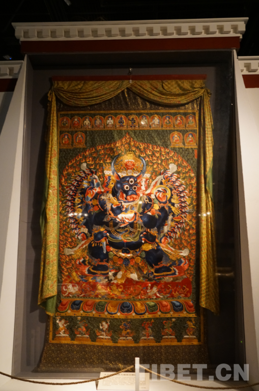 展览专辟了一个区域展示西藏唐卡画的发展衍生。其中,有一幅明永乐年间的刺绣大威德金刚唐卡堪称“明星展品”。这幅高约4.3米的唐卡针线细腻,色彩鲜艳,造型生动,为密针叠线绣制手法。