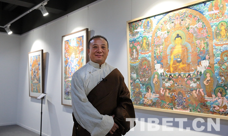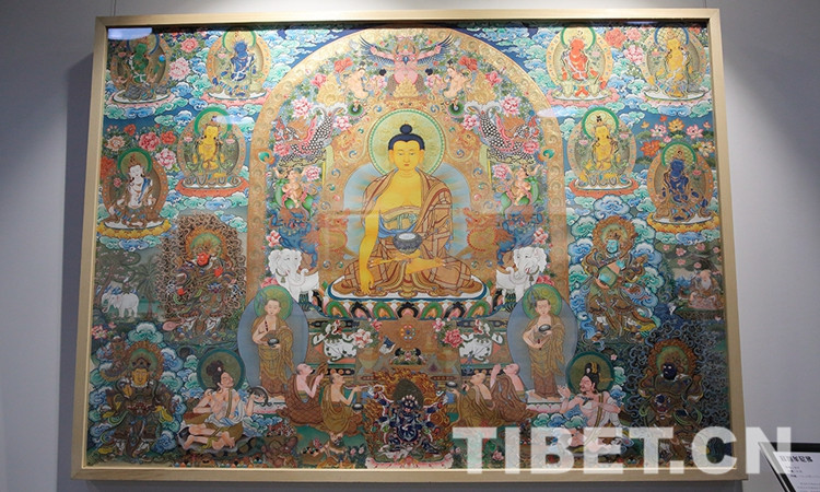 展览共展出中国工艺美术大师、国家非物质文化遗产项目代表性传承人娘本、以及其弟子参与创作的唐卡作品25幅。图为娘本唐卡作品《释迦摩尼佛》。摄影:杨月云
