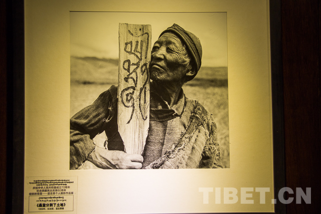 图为蓝志贵摄影作品《桑登分到了土地》,照片表现了西藏翻身农奴得到土地。