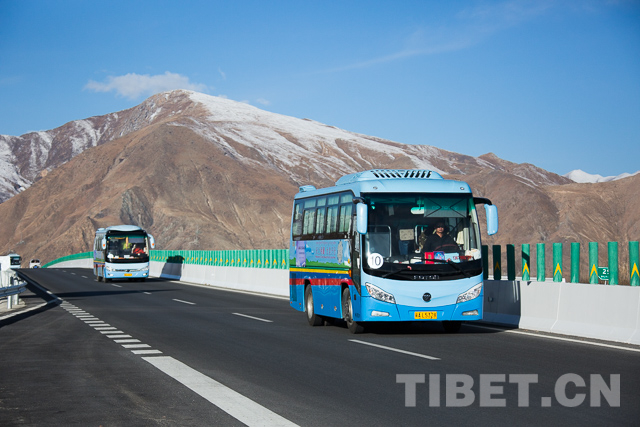 图为旅游大巴行驶在拉萨至林芝高等级公路上。摄影:赵耀