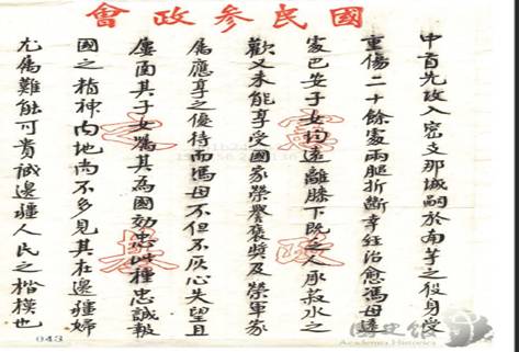 《国民参政会参政员喜饶嘉错等函国民政府主席蒋中正为边疆参政员冯云仙之母阿宗夫人教育子女颇有义方请予褒奖》(1947年6月5日),台北“国史馆”档案《协助抗战题颁匾额案》(一),典藏号:001—036180—00003;