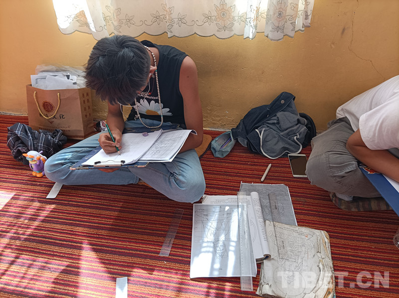 图为仁俊热贡艺术学院的学徒在练习画唐卡线条