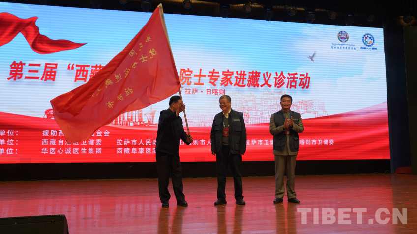 图为第三届“西藏人人健康”院士专家进藏义诊活动启动仪式授旗现场 摄影:王淑