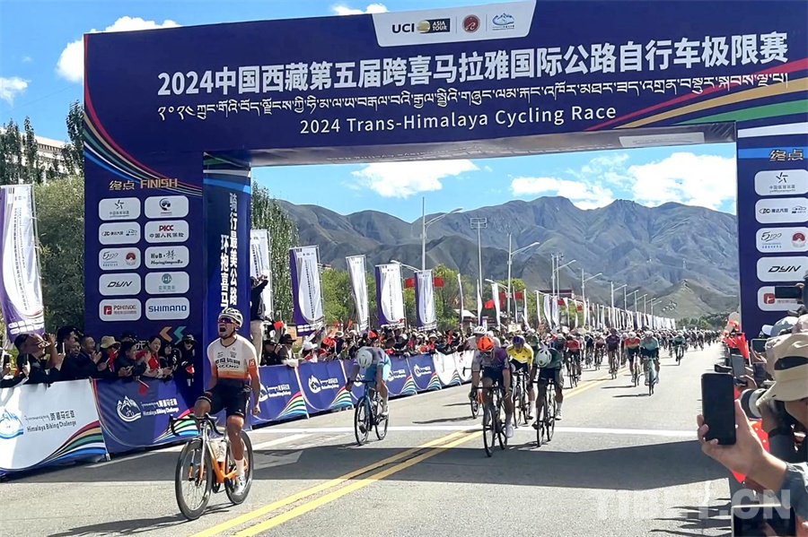 图为日喀则赛段自行车选手冲线现场 摄影:边子捷