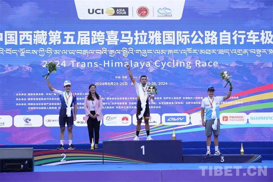 图为日喀则赛段前三名,同时该段第一名CHIA BERMUDEZ Luis Carlos摘下个人冲刺总积分的桂冠 摄影:边子捷
