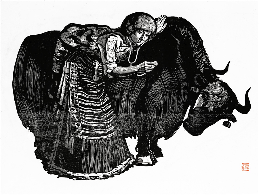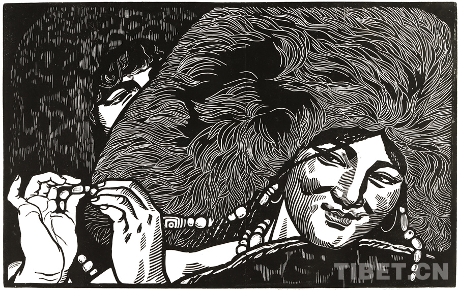 图为罗伦张作品《草原巡医》 (木版画 1979年)