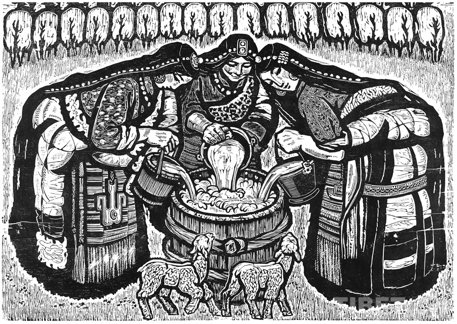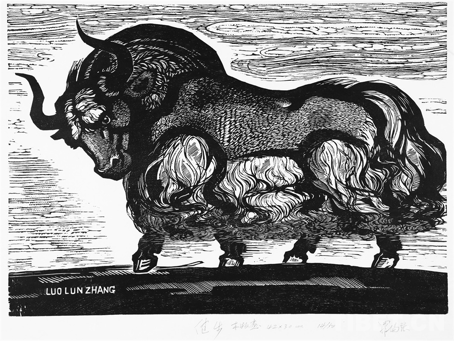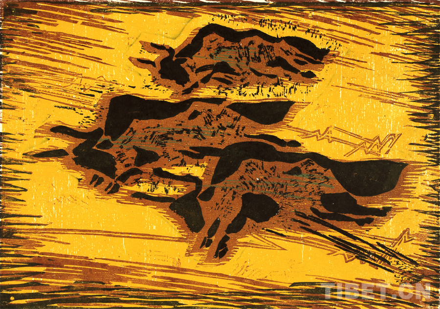 如果非要说我在版画技法上有什么创新,参照西藏匠人刻经文,在石头上刻出来然后印出来也许就算。这不是一般石版画概念,那叫石印,平版印刷;我这是凹版印刷。刻起来很费劲,我也不管费不费劲。我有一批这样的石刻作品。综合版作品手法较多,我通常分别在石板和木板上刻,然后套起来印。如果搞学术交流,也许值得一谈。至于说到创新,第一我不认为我有什么创新,第二我不认为在艺术上、在美术上能够轻易谈创新这个词。还有第三个观点:不需要创新。很简单,你先把传统学到手再说。既是传统,就有它的存在理由,否则早就夭折了,还传什么统呢?传,而且统啊!统是什么意思?基调是它统一起来的。先把传统学到手,炉火纯青了,神来之笔出现了,才有可能有所创造。基础是重要的。
