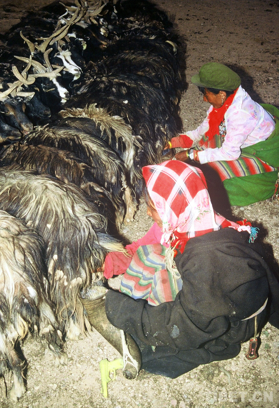 图为双湖办事处北措折乡(现双湖县措折羌玛乡)牧女使用牦牛角当器皿挤羊奶(唐召明1989年摄)