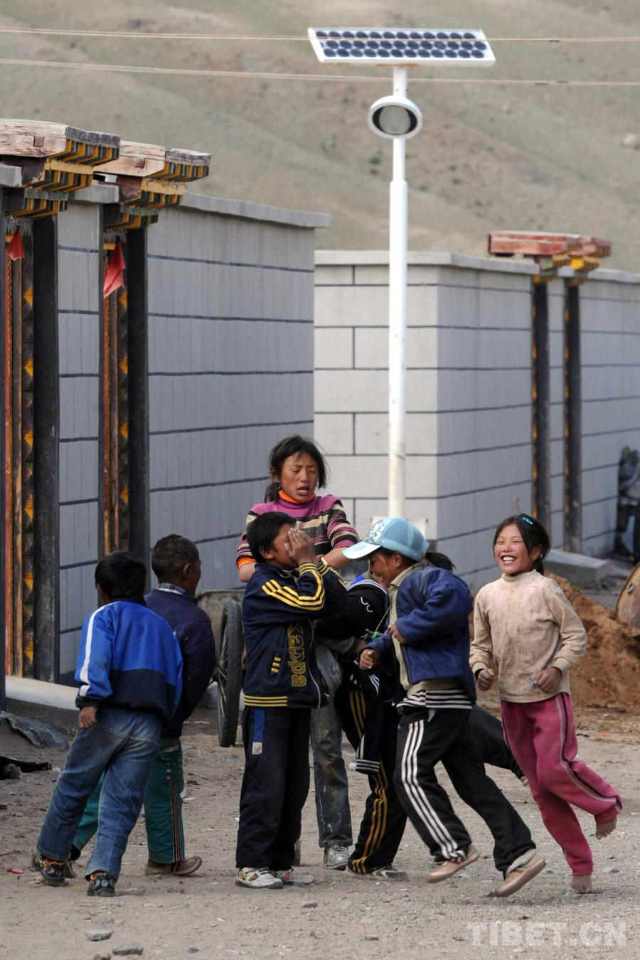 图为双湖特别区(现双湖县)嘎措乡新房前的孩子们在太阳能灯柱下玩耍(唐召明2009年8月1日摄)