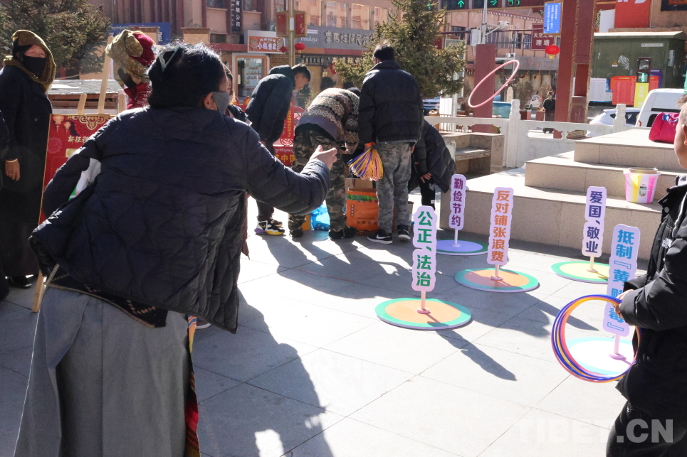 在新时代文明实践集市,以互动游戏为主,分设了“文明新风”主题套圈游戏和“文明举止”红黑榜分类游戏、“垃圾分类”沙包投放游戏、文明家风亲子拼图等项目,每个区域前都挤满了游玩体验的人群。“这个套圈游戏很受欢迎,我们把‘爱国敬业’‘反对铺张浪费’等社会主义核心价值观有关内容制作成套圈道具,让大家在趣味活动中了解文明理念。”理塘县委宣传部工作人员介绍道。