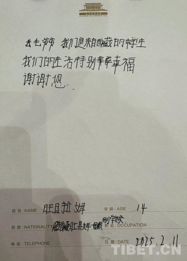 “敬爱的毛爷爷,您好!我是一名来自西藏阿里的中学生。从远方至此,赴一面之约。谢谢您对祖国的一切付出。如今的祖国如您所愿,山河无恙,国泰民安。我们将牢记您的教导,认真学习,将来必定做一名对社会有用的人!”