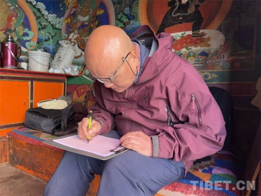 图为罗文华在萨迦寺内认真测绘 摄影:王妍丹