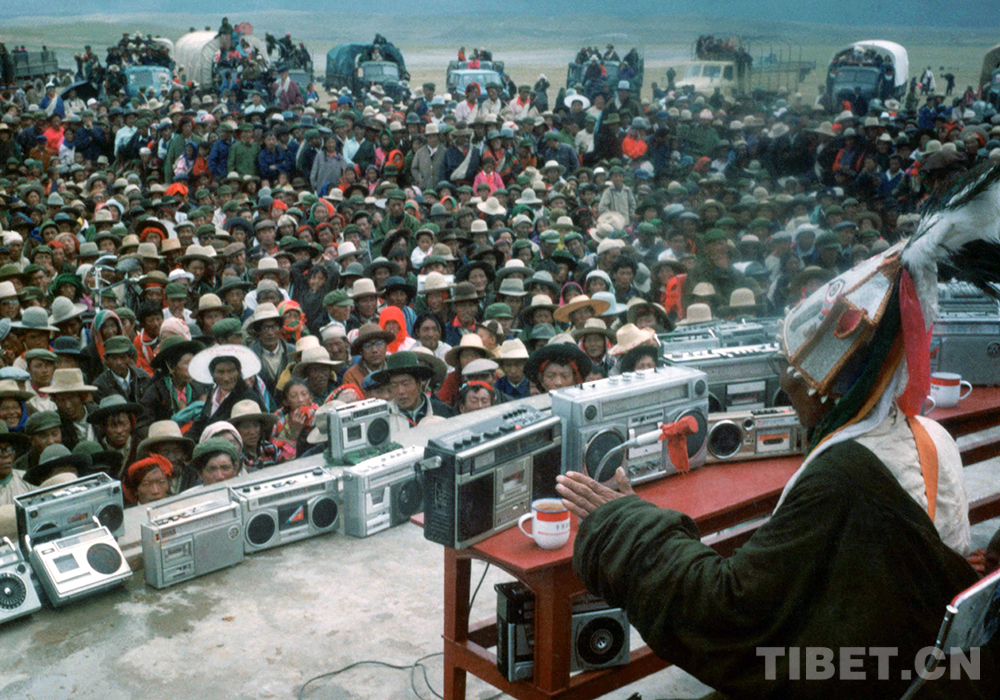 图为说唱艺人阿达在那曲赛马会上说唱《格萨尔》的传奇故事,台上摆满了牧民群众的各式录音机(唐召明提供,才龙1987年前后摄)