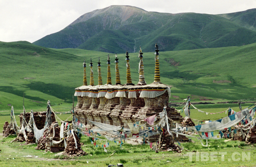 图为当雄至那曲不远处,公路边所立的八座白塔(唐召明1998年摄)