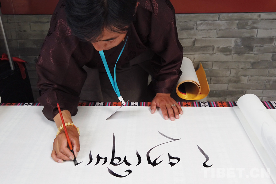 图为那曲市书法家协会的斯秋平措现场展示藏文书法 摄影:杨月云