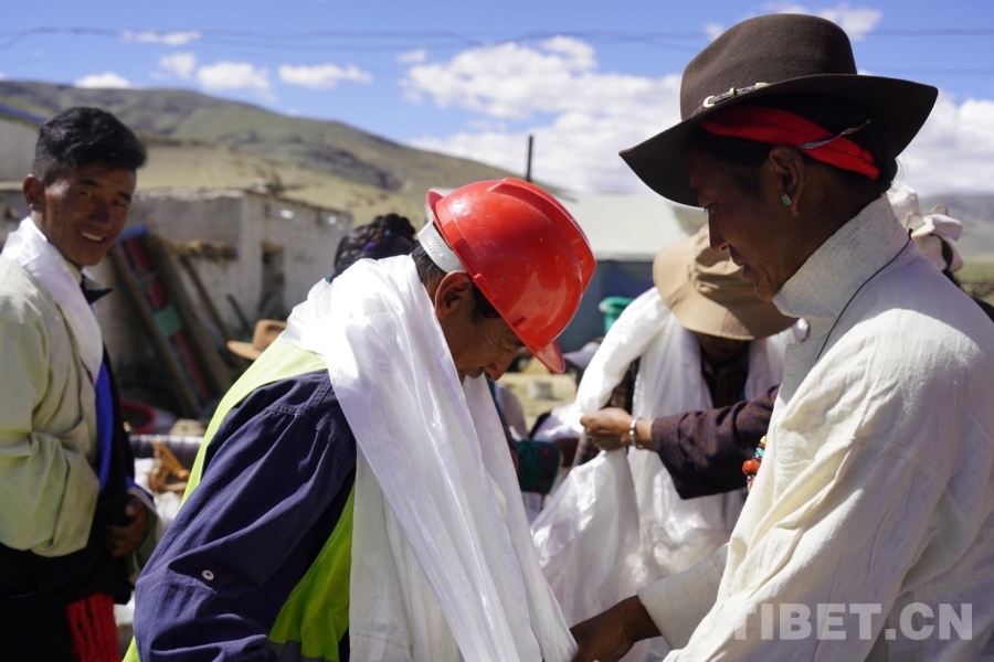 图为封顶仪式上村民为施工队工作人员献哈达