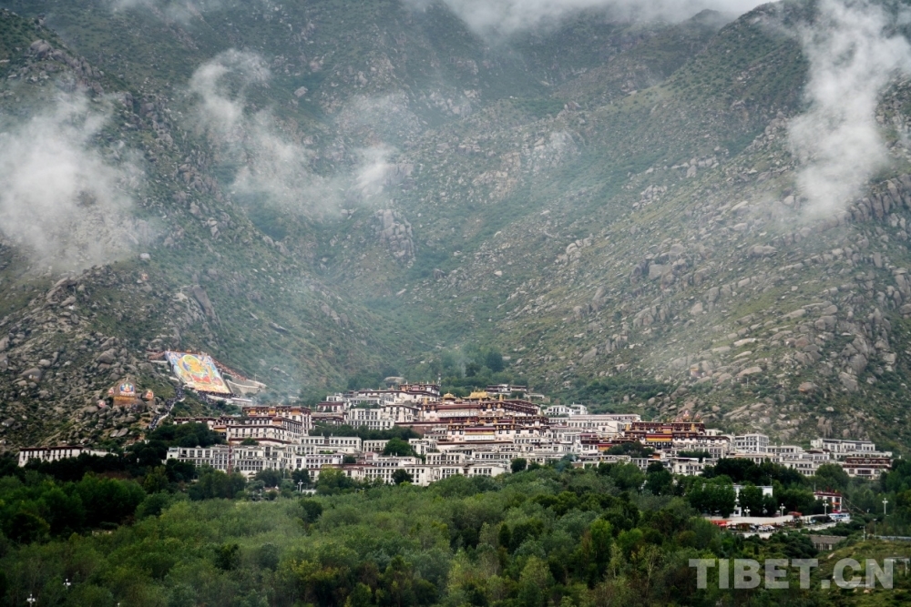 图为远眺哲蚌寺展佛与哲蚌寺全景 摄影:冯重霖