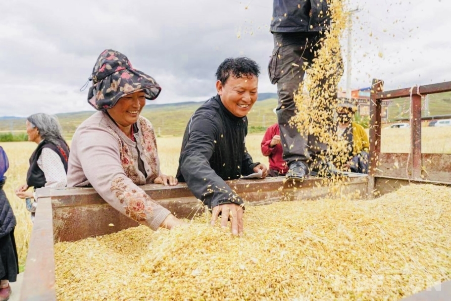 中国西藏网讯 8月29日,四川省甘孜藏族自治州甘孜县拖坝乡拖坝四村的500亩青稞基地里,收割机轰鸣作响,饱满的青稞穗被整齐收割。甘孜县12万亩青稞陆续成熟,高原上一片金黄。据甘孜县农牧农村和科技局数据显示,今年全县青稞预计总产量达27805吨,较去年增长4.9%,再创历史新高。